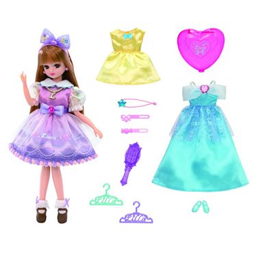 ピンク×パープルのワンピースを着たリカちゃんの他、着せかえて遊べる水色のロングドレス&パンプス、レモンイエローのミニドレスがセットになっています。