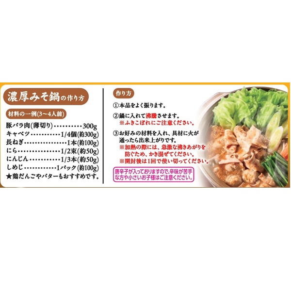 鶏ガラととんこつのスープに、米みそと豆みそをあわせ、しょうがやにんにくなど香味野菜の風味を加えた濃厚でコクのあるみそ鍋つゆです。〆にはバターを加えてみそバターラーメンがおすすめです。