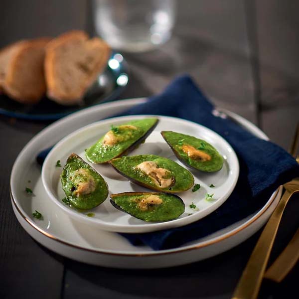 ムール貝の貝殻に、ムール貝、パセリとガーリックを練りこんだバターを盛り付けました。ワインとぴったりのオードブルです。